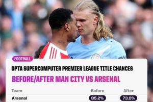 仍领先!Opta超算英超夺冠概率:阿森纳输球仍有73%,曼城升至27%